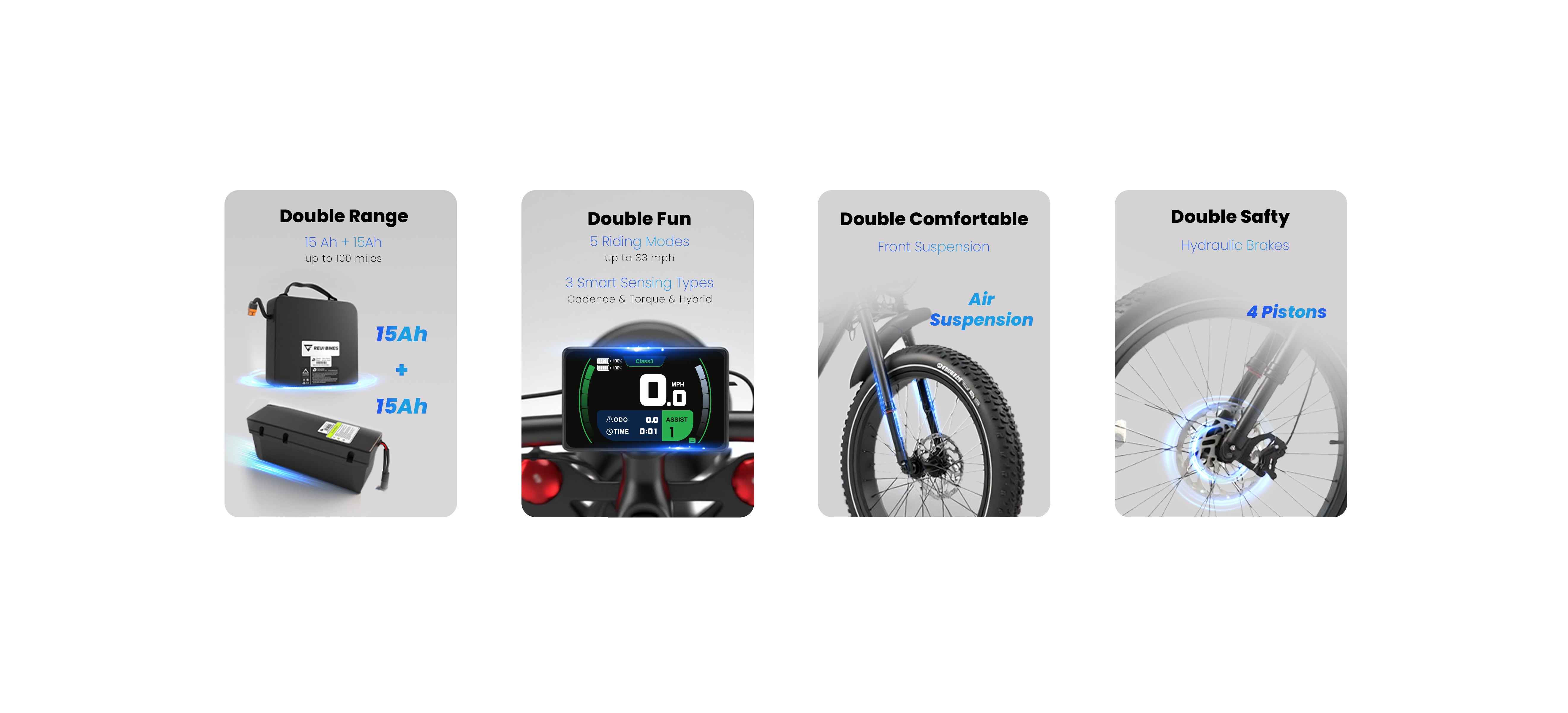 フロントフォークサスペンションを装備し、走行中の衝撃をほぼ吸収します。前後180mmのディスクローターを備えた高感度ブレーキシステムは、どんな天候でも確実なブレーキングを実現します。
